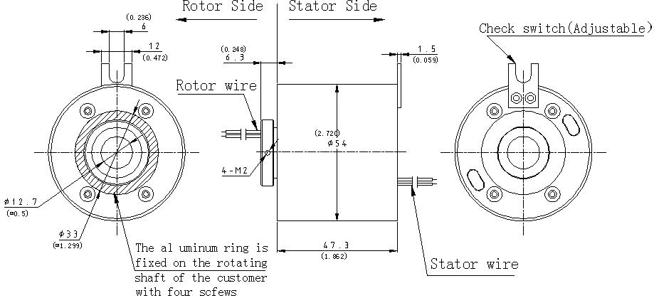 ◆ SRT012-54-1210是标准的帽式滑环,外径 54mm,长度 47.3mm,,12路* 10A(信号)